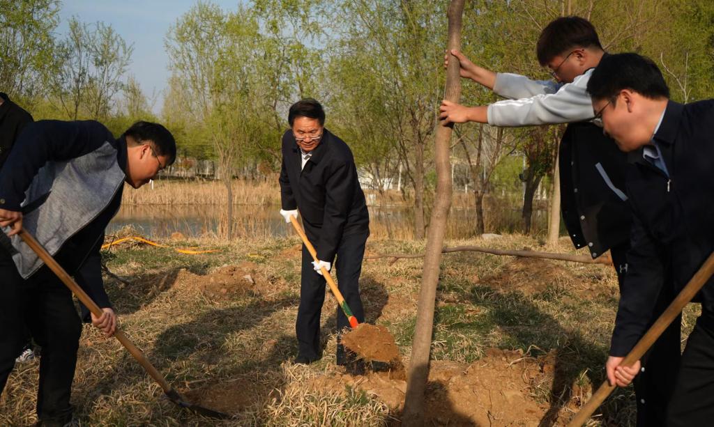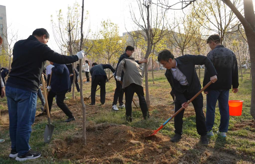 在市中校区综合实验楼前草地,校领导与大家一起挽起衣袖,拿起铁锨,共同参与到热火朝天的植树活动中来。大家热情高涨,有的用锄头、铲子挖坑;有的扶正树苗、回填泥土;有的灌溉浇水,每个环节都精心细致,大家分工明确,配合默契,现场一片繁忙有序的景象。校领导一边植树,一边叮嘱相关部门要加强苗木管理,确保植树取得实实在在效果。