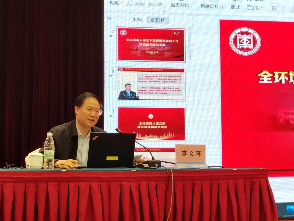 李文喜从“全”“融”“通”三个维度对全环境育人理念进行了阐释:从运行机制上实现“全”,即涵盖“学生工作系统内部的大思政”“主渠道主阵地相结合的大思政”“全校思政工作各要素相互协同的大思政”等三个层次。从工作形态上实现“融”,即要打开思路找角度,深入浅出讲故事;要遵循网络传播规律,强化互联网思维和一体化发展理念,推动各种媒介资源、生产要素有效整合,推动信息内容、技术应用、平台终端、人才队伍共享融通。从治理效能上实现“通”,即要从构建课程思政体系、主渠道和主阵地同向同行、打造学科思政平台、凝聚文化育人品牌、提升网络思政功效等方面,打造思想政治教育体系,抓好各要素之间的协同联动。