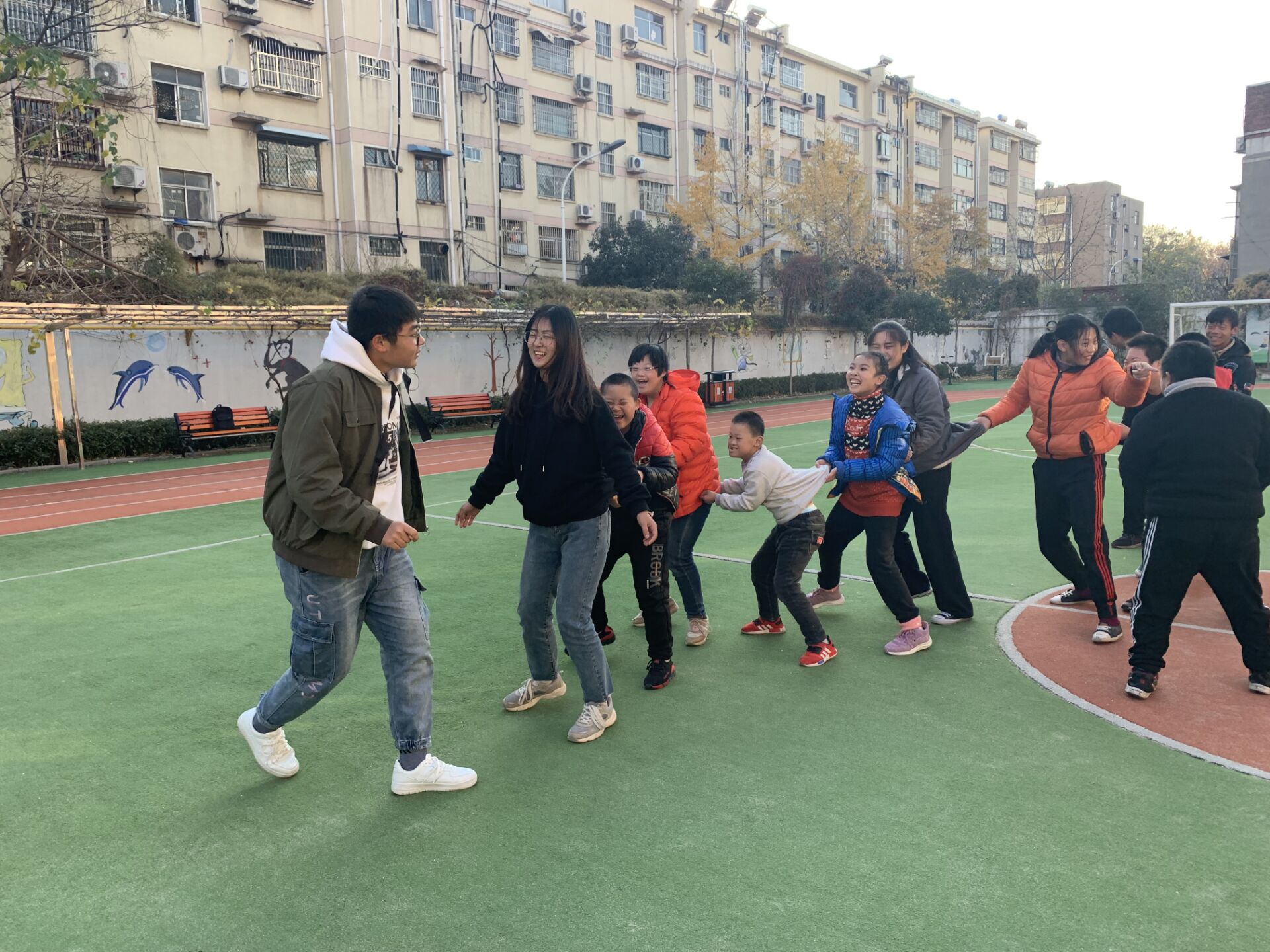 在特殊教育中心,志愿者们带来了精彩的手语表演——《逆光》,手把手教孩子们折纸,耐心与小朋友沟通交流。同时小朋友们也给志愿者准备了舞蹈表演,小小的身躯,可爱的动作,让人满心欢喜,甚是喜爱。另外,志愿者们还与小朋友一起做游戏,大家尽情地跑着、跳着,欢声笑语回荡在操场上空。
