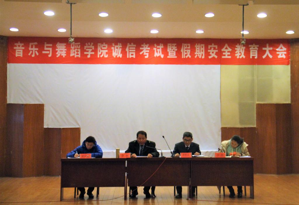 为全面落实立德树人根本任务,推进教育公平,推动考风考纪教育、诚信考试教育逐步实现制度化、常态化、规范化,营造公平、公正、和谐的考试环境,也为了强化学生的安全教育,音乐与舞蹈学院于2017年1月11日下午在音乐厅召开了“音乐与舞蹈学院诚信考试暨假期安全教育大会”。音乐与舞蹈学院院长李永、党总支副书记谭胜兵、全体辅导员班主任老师、2016级和2017级全体同学参加了本次大会。李永主持了会议。
