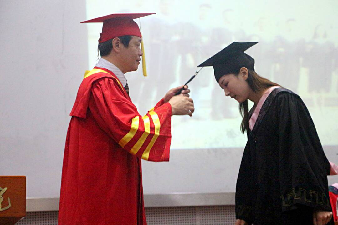 随后,在欢快的乐曲声中,曾宪明教授为毕业生逐一正冠扶苏,颁授学位证书,毕业生们依次登台尽享这神圣而有纪念意义的仪式,并与曾教授握手、拥抱、合影留念。教师代表安洪涛和学生代表张玮相继上台发言,张玮用深情的话语表达了对老师、母校的无限感恩和依依惜别之情。