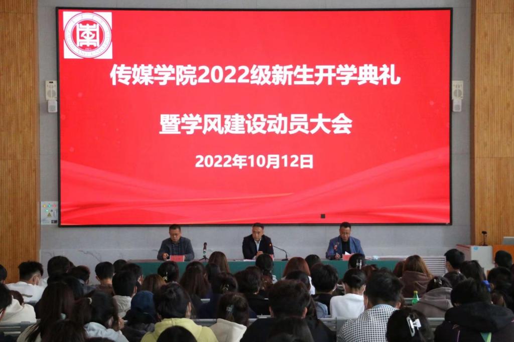 10月12日下午,传媒学院在增信楼报告厅召开2022级新生入学典礼暨学风建设动员大会,学院党政领导、全体教师出席活动,2022级全体新生、院班主要学生干部参加大会。典礼由院党总支副书记郑发奋主持。
